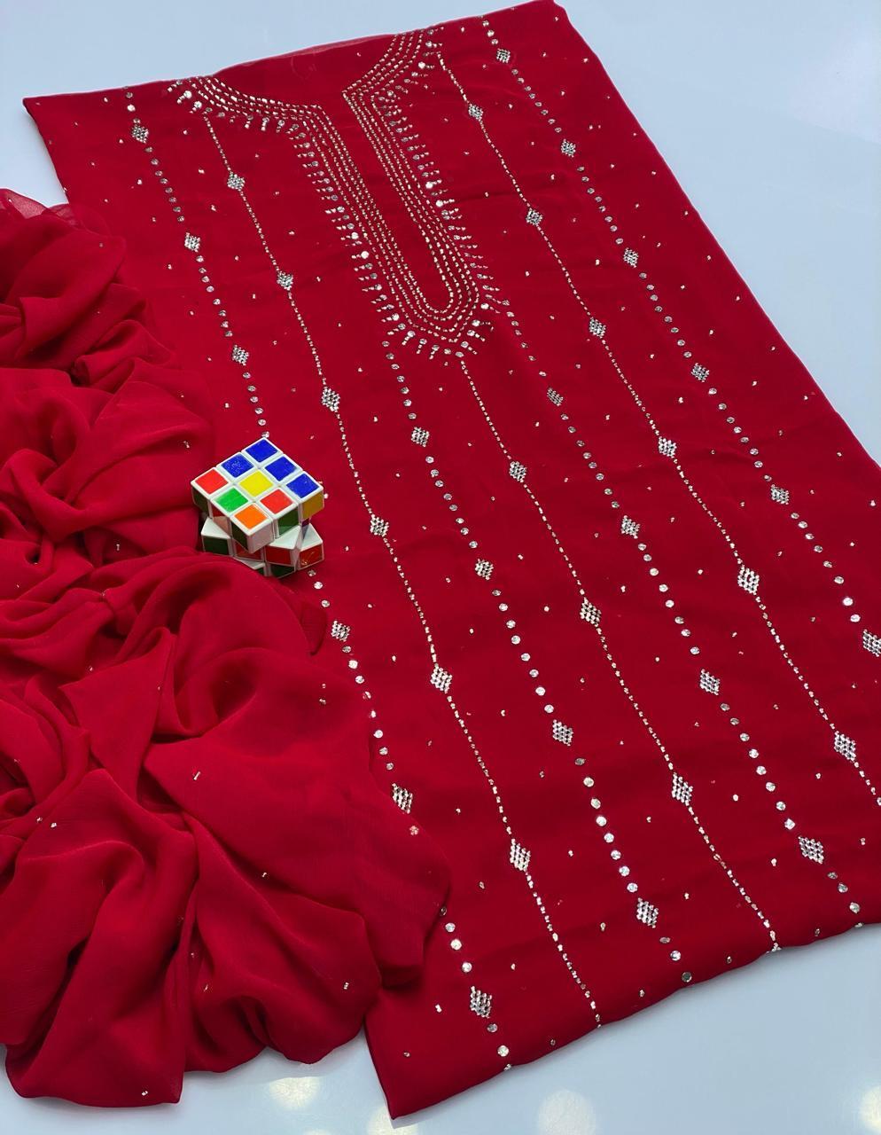 A perfect pick for women who love elegant embroidery, lightweight chiffon, and custom tailoring.